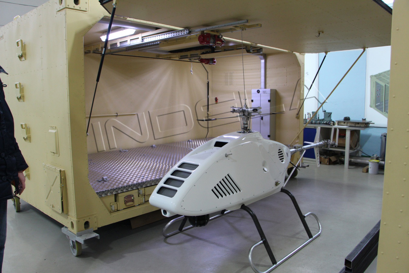 The house-type body is equipped with two winches for the UAV unloading and loading, filling station for the UAV refuelling. The compartment is equipped with lightening, earthing, fire-extinguishing means, charging device, accumulator battery, and in the raised floor there are recesses for main rotor blades and SPTA set.